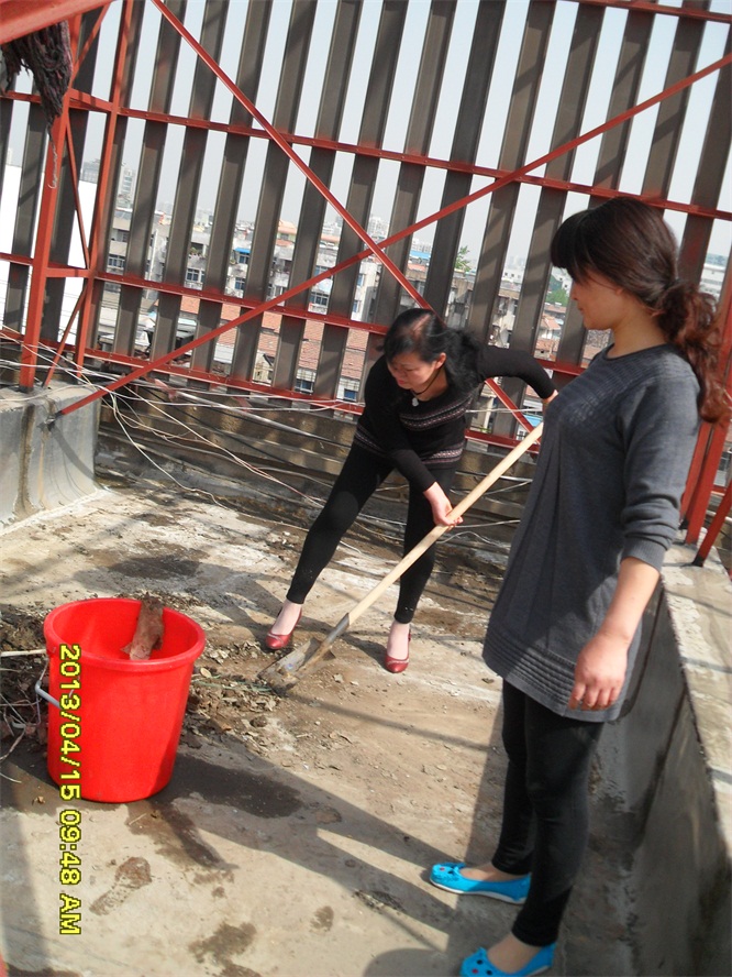 因地點狹小女工們團結(jié)協(xié)作清理二樓挑檐上的雜物