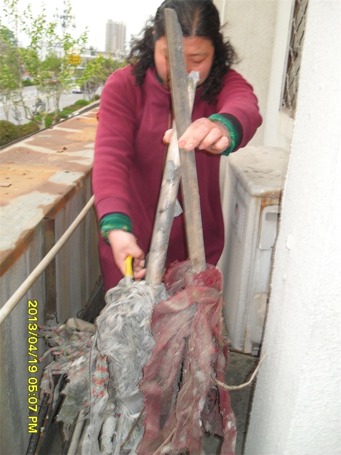女工在清理前五樓樓面上的雜物