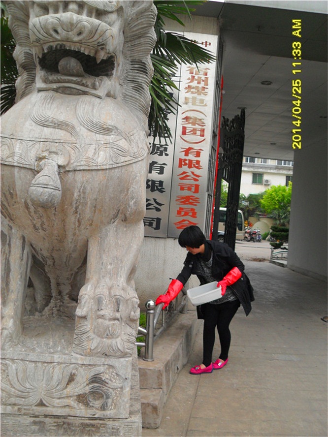 行政處員工李倩倩在擦洗欄桿
