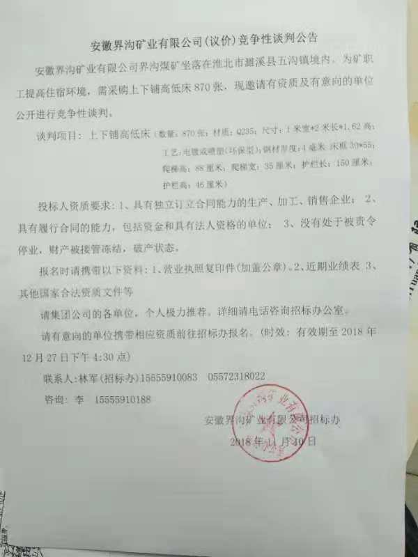 界溝礦業(yè),上下鋪高低床招標公告