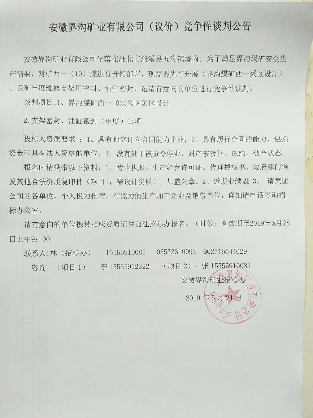 安徽界溝礦業(yè)有限公司(議價(jià))競(jìng)爭(zhēng)性談判公告
