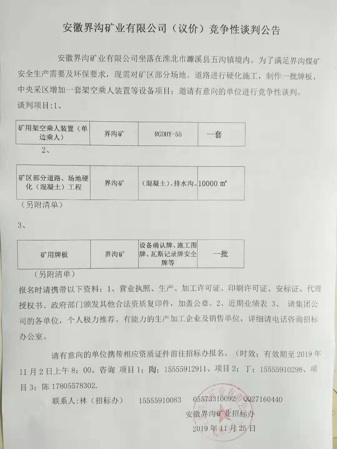安徽界溝礦業(yè)有限公司(議價(jià))競(jìng)爭(zhēng)性談判公告