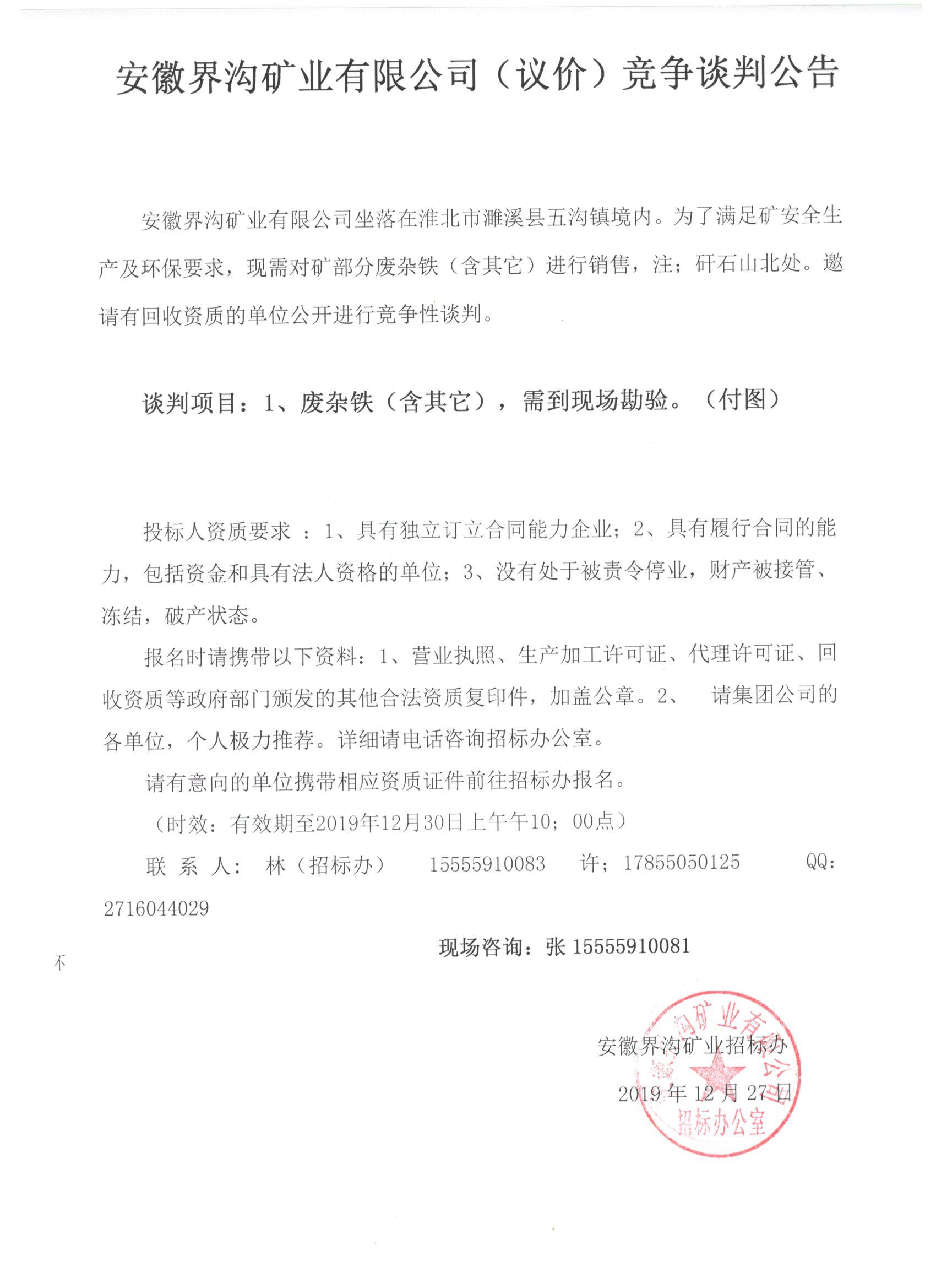 安徽界溝礦業(yè)有限公司(議價(jià))競(jìng)爭(zhēng)性談判公告