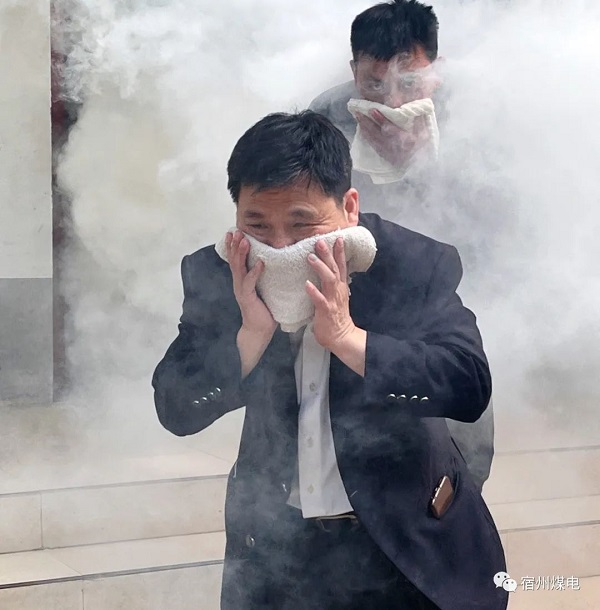10:01分,模擬場景展現(xiàn)了職工3號宿舍樓201房間窗戶往外冒煙,一位員工發(fā)現(xiàn)該房發(fā)生火災(zāi),煙霧滾滾,當(dāng)即大聲向外呼喊“著火了,快來救火”,并立即向保衛(wèi)科報警。保衛(wèi)科科長張健聞訊后,立即電話向礦有關(guān)領(lǐng)導(dǎo)匯報并組織救援人員。10:03分,礦總指揮李國強接到匯報后立即下令,啟動《火災(zāi)應(yīng)急疏散預(yù)案》,迅速組織應(yīng)急救援和消防員著裝消防服,乘坐消防車火速前往現(xiàn)場,第一時間進行人員疏散和滅火行動。10:05分,疏散引導(dǎo)組組長劉小保帶領(lǐng)救援人員進入3號樓,分別從著火房間向兩側(cè)逐個房間敲門喊話,將正在房間休息的人員全部叫醒,并讓每位職工采用濕毛巾或口罩捂住口鼻,采取下蹲姿勢,匍匐或爬行撤離,還讓人員按秩序不得亂擠,確保全部房間人員如數(shù)撤出。10:08分,滅火行動組組長鄧宇帶領(lǐng)消防人員利用消防車往宿舍樓窗戶內(nèi)噴水,火勢控制后,救援人員又用滅火器到室內(nèi)進行細(xì)致滅火,直至完全熄滅。10:18分,疏散引導(dǎo)組組長劉小保和滅火行動組組長鄧宇向總指揮李國強匯報:人員已全部撤離,未發(fā)生人員受傷,火源也全部撲滅。隨后,李國強宣布:演練圓滿結(jié)束。