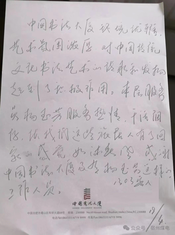 ”中國書法大廈環(huán)境優(yōu)雅,藝術(shù)氛圍濃厚,對中國傳統(tǒng)文化藝術(shù)的傳承和發(fā)揚起到了積極作用。本層服務(wù)員楊玉芳服務(wù)熱情,干活細仔(仔細),使我們這些旅居人有了回家的感覺,如沐春風,感謝中國書法大廈及像楊玉芳這樣的工作人員?!?/span>